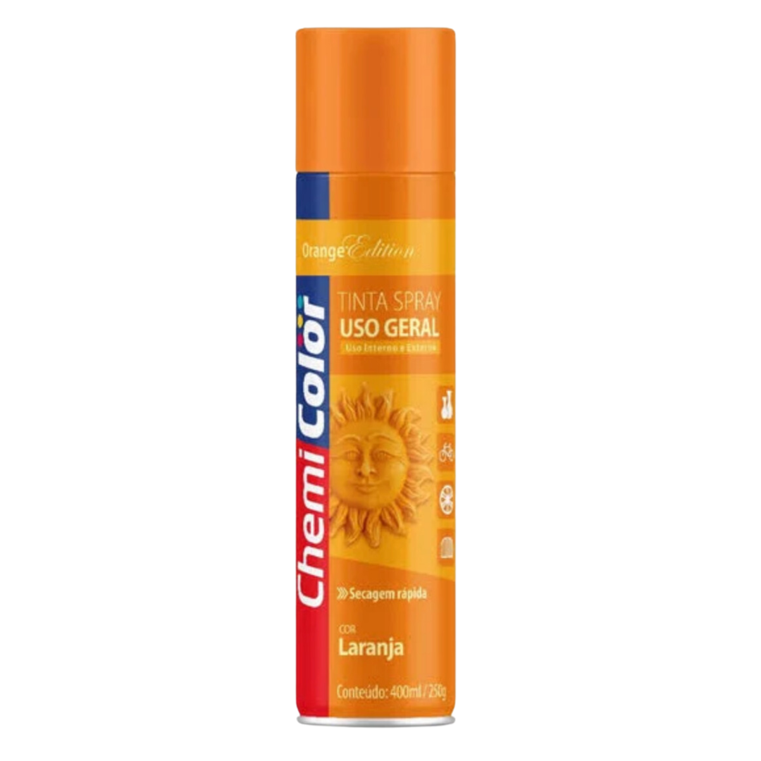 Chemicolor – Spray de Uso Geral – 400ml – Laranja Brilhante é indicada para diversos tipos de pintura, garantindo uma boa cobertura e acabamento.